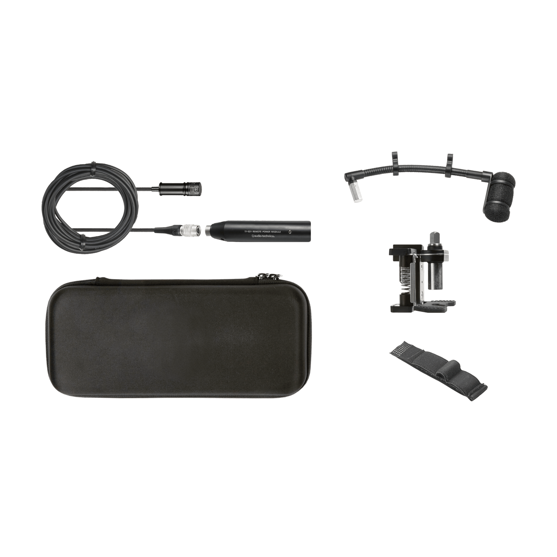 When teamed with the included AT8491D drum mount and strong, flexible AT8490 5" gooseneck, the mic can be securely fastened to the drum and positioned to stay where you want it. The drum mount’s unique spring-loaded mechanism clamps it tightly to a drum lug (without hindering your ability to adjust the lug) and provides excellent shock resistance for the mic; the gooseneck’s rigidity ensures that it won’t flop around no matter how aggressively you play. The microphone’s cardioid polar pattern isolates the instrument by reducing side and rear pickup, and the switchable 80 Hz high-pass filter on the in-line power module helps control undesired low-frequency noise. The system also includes an AT8468 violin mount with hook-and-loop fastener and a protective carrying case.