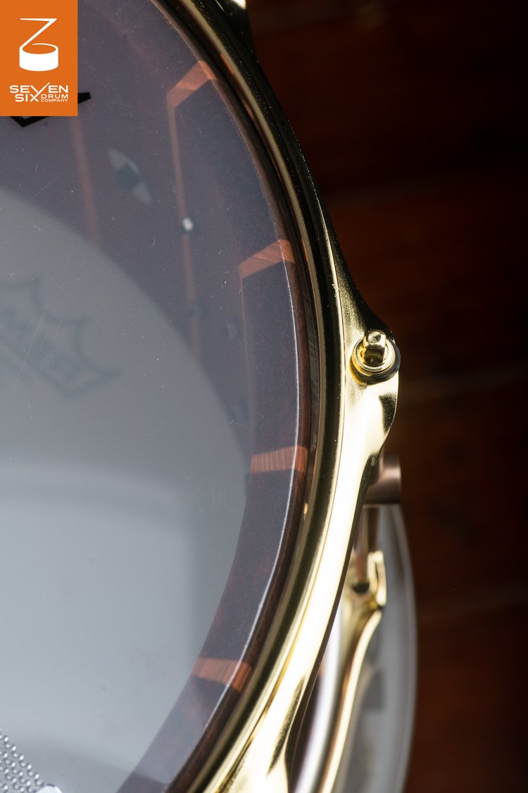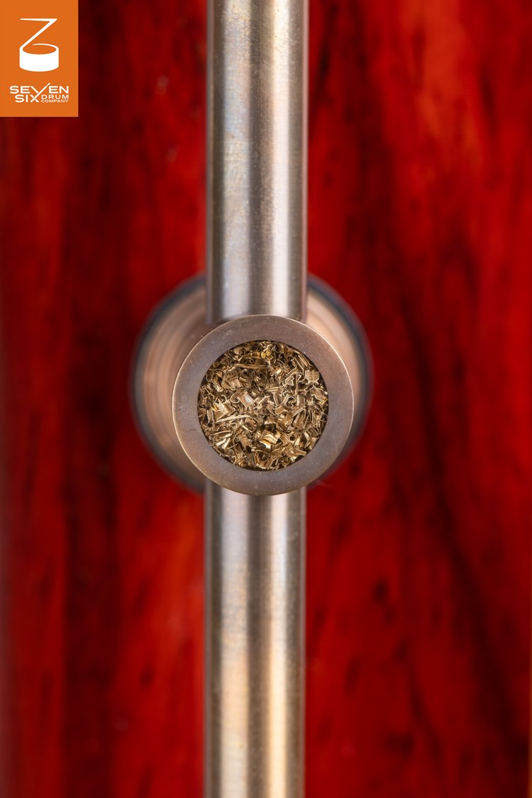 handmade brass lugs with an Antique Brass finish and center point brass shavings inlaid in resin from W Odd Drums in Serbia