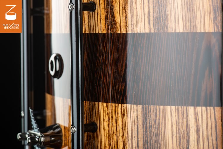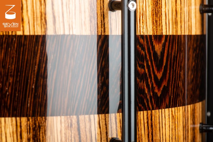 This 8x14 custom handcrafted snare drum is built from 100 individual staves (pieces of wood). It’s essentially 5 separate drums combined to make one. The top and bottom layers on this drum cake are exotic, hard Canarywood. The 2nd and 4th layers are also exotic and also hard Zebrawood (canaries and zebras LOVE each other). The middle layer is super hard and pricey wenge…I’m calling it “Crystal Wenge” because, much like the Crystal Wenge snare that I built just before I built this drum, this wenge section has a wash of polyurethane clear coat that I sanded off, leaving tiny crystals buried deep in the grain for a little bling. I topped it off with a crystal clear, glossy, glassy, pricey, pretty, durable polyester clear coat. The bearing edges are roundover/30 degrees on this 1/2 inch thick shell. To continue the striking and dramatic vertical lines in this drum, I used long, simple vertical low-mass black powdercoated lugs from Champgane Drums. This custom snare drum has black nickel 3mm triple flanged hoops, chrome tension rods to match the chrome lug screws, Puresound 24 strand snare wires, an INde black nickel throw off and butt plate, and Remo heads. This custom snare drum has a huge tuning range and is obviously a beautiful specimen.