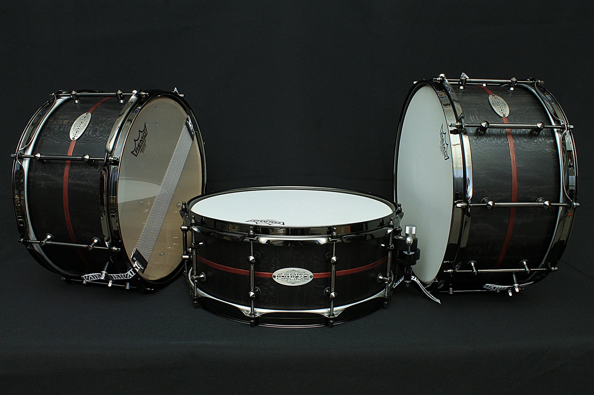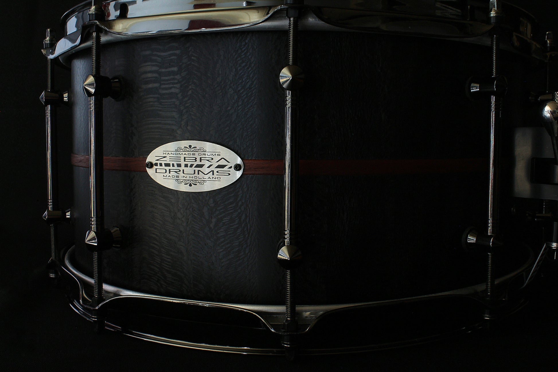 The latest edition to the Zebra drums arsenal: the Black Plane Series. These unique looking snare drums are made from the London Plane tree, which gives these snare drums a warm full bodied tone with a great attack. The shells are made with the Zebra drums standard fingerjointed quarter sawn staves and all have a thickness of 9 mm. They are finished with a special black stain and a raised walnut inlay that has been stained red. The final finish are several coats of a satin oil. The snare drums are fitted with all black hardware, using a different lug than I normally use which really suits the Black Plane concept. Additionally they are fitted with 2,3 mm triple flanged hoops, a Trick strainer, Canopus wires with Zebra Drums’ own durable straps, Remo heads and Thread Locks (by Zebra Drums).